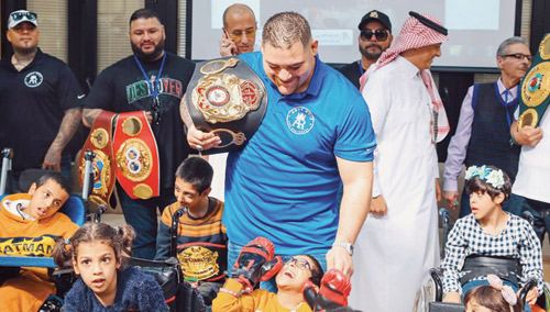 وبدأ بطل الملاكمة للوزن الثقيل بزيارة لجمعية الأطفال المعوقين، وهي واحدة من كبرى مؤسسات إعادة تأهيل الأطفال المعوقين في المنطقة العربية، حيث قضى بعض الوقت للتفاعل مع الأطفال ذوي الإعاقة والحديث عن أهمية الرياضة في الحياة اليومية، ومن ثم قام بتقديم الهدايا والتقاط الصور معهم.