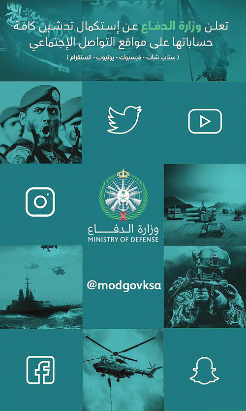 وأكد معالي رئيس هيئة الأركان العامة من خلال تدشينه حسابات وزارة الدفاع بذل كل الجهود واستثمار كل الإمكانات والطاقات للاستفادة من هذه الحسابات للمساهمة في إبراز القوات المسلحة والحرص على الدقة في العمل الإعلامي وتقديم الرسالة الإعلامية السامية التي تعكس ما وصلت إليه وزارة الدفاع بشكل خاص والمملكة بشكل عام من تطور وإبراز جهودها في التصدي لكل من يحاول المساس بأمن الوطن الغالي، سائلاً الله العلي القدير أن يديم على وطننا عزه وشموخه وأمنه واستقراره بقيادة خادم الحرمين الشريفين الملك سلمان بن عبد العزيز آل سعود القائد الأعلى لكافة القوات العسكرية، وصاحب السمو الملكي الأمير محمد بن سلمان بن عبد العزيز ولي العهد نائب رئيس مجلس الوزراء وزير الدفاع - حفظهما الله - .