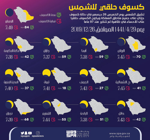 حذرت وزارة الصحة من النظر إلى أشعة الشمس في سماء المملكة أثناء حدوث ظاهرة الكسوف الحلقي صباح اليوم الخميس.