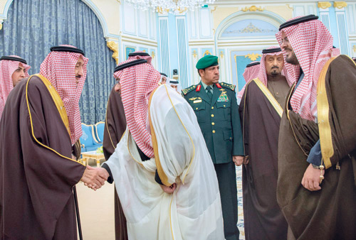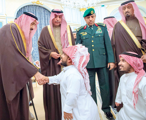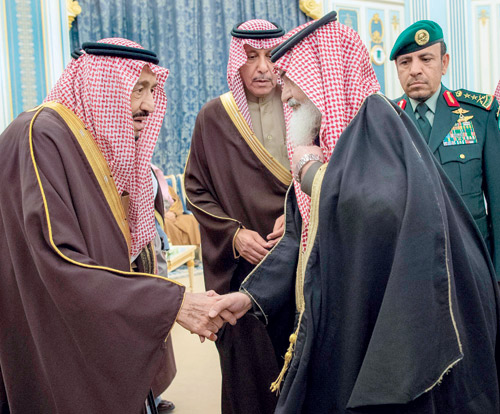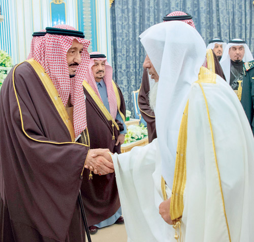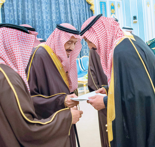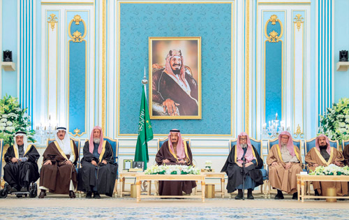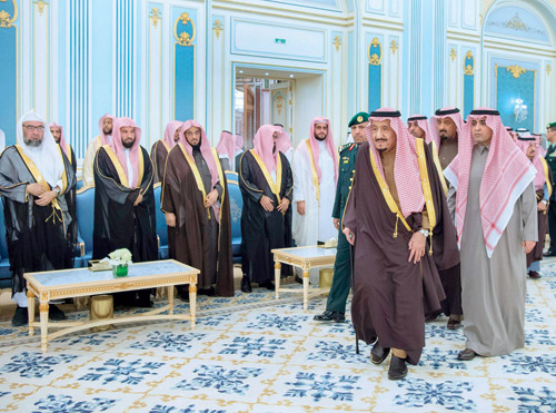 استقبل خادم الحرمين الشريفين الملك سلمان بن عبدالعزيز آل سعود - حفظه الله -، أمس أصحاب السمو الأمراء، وسماحة مفتي عام المملكة، وأصحاب الفضيلة العلماء، وجمعاً من المواطنين الذين قدموا للسلام عليه - رعاه الله. وفي بداية الاستقبال، أنصت الجميع لتلاوة آيات من القرآن الكريم. ثم تشرف الحضور بالسلام على خادم الحرمين الشريفين - أيده الله. حضر الاستقبال، صاحب السمو الأمير سعد بن عبدالله بن تركي، وصاحب السمو الأمير بندر بن عبدالله بن عبدالرحمن، وصاحب السمو الملكي الأمير تركي الفيصل بن عبدالعزيز، وصاحب السمو الملكي الأمير فيصل بن بندر بن عبدالعزيز أمير منطقة الرياض، وصاحب السمو الملكي الأمير خالد بن سعد بن عبدالعزيز، وصاحب السمو الملكي الأمير محمد بن مشاري بن عبدالعزيز، وصاحب السمو الملكي الأمير خالد بن بندر بن عبدالعزيز مستشار خادم الحرمين الشريفين، وصاحب السمو الملكي الأمير متعب بن عبدالله بن عبدالعزيز، وصاحب السمو الملكي الأمير فيصل بن خالد بن عبدالعزيز مستشار خادم الحرمين الشريفين، وصاحب السمو الملكي الأمير محمد بن نواف بن عبدالعزيز مستشار خادم الحرمين الشريفين، وصاحب السمو الأمير تركي بن فهد بن جلوي، وصاحب السمو الأمير نواف بن محمد بن عبدالله، وصاحب السمو الملكي الأمير فهد بن مساعد بن سعود بن عبدالعزيز، وصاحب السمو الأمير الدكتور مشعل بن عبدالله بن مساعد، وصاحب السمو الأمير الدكتور تركي بن سعود بن محمد المستشار في الديوان الملكي، وصاحب السمو الملكي الأمير نهار بن سعود بن عبدالعزيز، وصاحب السمو الأمير فيصل بن عبدالعزيز بن مشاري، وصاحب السمو الأمير عبدالمحسن بن عبدالله بن عبدالرحمن، وصاحب السمو الملكي الأمير منصور بن ناصر بن عبدالعزيز سفير خادم الحرمين الشريفين لدى سويسرا، وصاحب السمو الأمير خالد بن ثنيان بن محمد، وصاحب السمو الأمير الدكتور بندر بن سلمان بن محمد، وصاحب السمو الأمير فهد بن سعد بن تركي، وصاحب السمو الأمير سعود بن عبدالله بن محمد، وصاحب السمو الأمير سعود بن عبدالله بن فرحان، وصاحب السمو الملكي الأمير سعود بن مشعل بن عبدالعزيز، وصاحب السمو الأمير سعود بن ناصر بن فرحان، وصاحب السمو الملكي الأمير سعود بن فيصل بن مساعد بن سعود بن عبدالعزيز، وصاحب السمو الملكي الأمير خالد بن فيصل بن بندر بن خالد بن عبدالعزيز، وصاحب السمو الأمير محمد بن نايف بن عبدالله، وصاحب السمالأمير سعود بن فيصل بن فرحان، وصاحب السمو الملكي الأمير عبدالمجيد بن عبدالإله بن عبدالعزيز، وصاحب السمو الأمير فيصل بن بدر بن جلوي.
