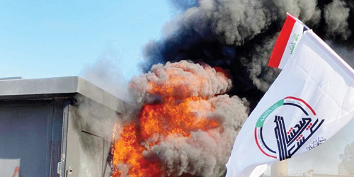 أحرقت ميليشيات عراقية أمس الثلاثاء البوابة الثانية للسفارة الأمريكية في بغداد في محاولة لاقتحامها. وهاجم محتجون عراقيون يحملون أعلام الحشد الشعبي وحزب الله العراقي السفارة الأمريكية في بغداد، ونجحوا في اقتحام الساحة الخارجية للسفارة بعد حرق إحدى البوابات، منددين بالضربات الجوية الأمريكية التي استهدفت الأحد الماضي قواعد تابعة لكتائب حزب الله العراقي الموالي لإيران، كما أحرقوا أعلاماً وحطموا كاميرات مراقبة، وقاموا بتكسير البوابات الأمنية في محيط السفارة. كما قام عدد من المهاجمين بحرق « كرفانات « الحماية الخاصة بالسفارة عند البوابات الخارجية، فيما لم تتدخل القوات العراقية لحماية السفارة الأمريكية. وأطلق حراس السفارة الأمريكية قنابل صوتية على أنصار الحشد خارجها، فيما أصيب 12 من أنصار الحشد جراء إطلاق الغاز المسيل للدموع الذي أطلقته القوات الأمنية لتفريق الجموع المحتشدة أمام السفارة الأمريكية، إلا أن ميليشيات الحشد تحدثت عن 62 مصابا من عناصرها أمام السفارة. ووصل وزير الداخلية العراقي وعدد من النواب إلى محيط السفارة الأمريكية في بغداد، فيما طالب رئيس حكومة تسيير الأعمال عادل عبدالمهدي الجميع بالمغادرة فورا من أمام السفارة، محذرا أن أي اعتداء أو تحرش بالسفارات والممثليات هو فعل ستمنعه بصرامة القوات الأمنية ويعاقب عليه القانون.