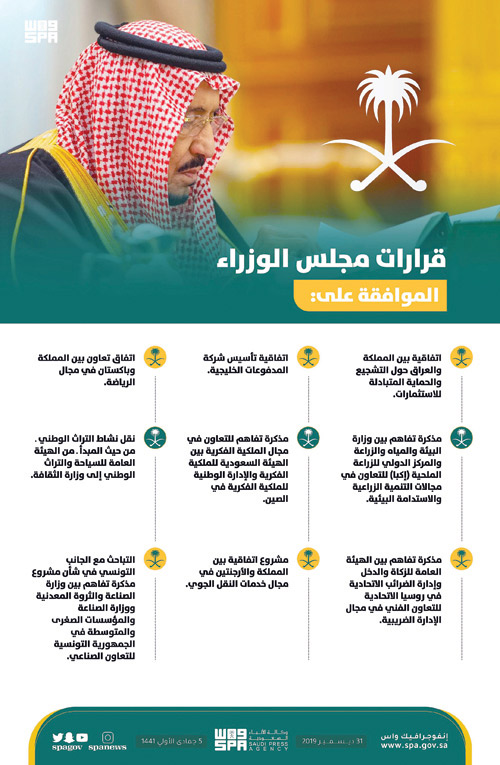 ثانيًا: بعد الاطلاع على ما رفعه معالي وزير التجارة والاستثمار رئيس مجلس إدارة الهيئة السعودية للملكية الفكرية، وبعد النظر في قرار مجلس الشورى رقم (15 / 3) وتاريخ 16 - 3 - 1441هـ، قرر مجلس الوزراء الموافقة على مذكرة تفاهم للتعاون في مجال الملكية الفكرية بين الهيئة السعودية للملكية الفكرية في المملكة العربية السعودية والإدارة الوطنية للملكية الفكرية بجمهورية الصين الشعبية.