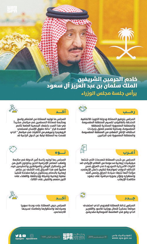 وأوضح معالي وزير الإعلام الأستاذ تركي بن عبدالله الشبانة، في بيانه لوكالة الأنباء السعودية، عقب الجلسة، أن المجلس، استعرض إثر ذلك، تطورات الأحداث ومستجداتها في المنطقة والعالم، مؤكدًا ما توليه المملكة من اهتمام واسع ومتابعة لمعاناة المسلمين في ميانمار، مشيدًا في هذا الصدد باعتماد الجمعية العامة للأمم المتحدة قرار « حالة حقوق الإنسان لمسلمي الروهينجا وغيرهم من الأقليات في ميانمار» الذي تقدمت به المملكة نيابة عن الدول الراعية له، وذلك انطلاقًا من إيمانها بضرورة التوصل إلى حلٍ لمأساتهم والاعتراف بحقهم في المواطنة والحياة الكريمة.