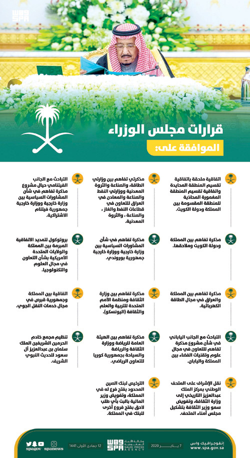 سادساً: بعد الاطلاع على ما رفعه صاحب السمو وزير الثقافة، وبعد النظر في قرار مجلس الشورى رقم ( 27 / 6 ) وتاريخ 30 / 3 / 1441هـ، قرر مجلس الوزراء الموافقة على مذكرة تفاهم بين وزارة الثقافة في المملكة العربية السعودية ومنظمة الأمم المتحدة للتربية والعلم والثقافة (اليونسكو).