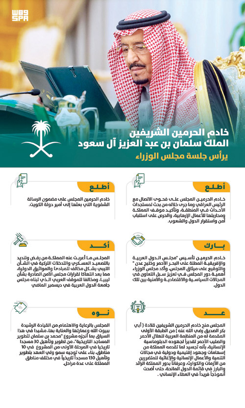 رأس خادم الحرمين الشريفين الملك سلمان بن عبدالعزيز آل سعود ـ حفظه الله ـ الجلسة التي عقدها مجلس الوزراء أمس في قصر اليمامة. وفي بدء الجلسة أطلع الملك المفدى المجلس على فحوى الاتصالين الهاتفيين مع فخامة الرئيس إيسوفو محمدو رئيس جمهورية النيجر، وفخامة الرئيس الدكتور برهم صالح رئيس جمهورية العراق، وما جرى خلالهما من بحث لمستجدات الأحداث في المنطقة، وتأكيد موقف المملكة ومحاربتها للأعمال الإرهابية، والحرص على استتباب أمن واستقرار الدول والشعوب، ومضمون الرسالة الشفوية التي بعثها ـ أيده الله ـ لأخيه صاحب السمو الشيخ صباح الأحمد الجابر الصباح أمير دولة الكويت. كما أطلع خادم الحرمين الشريفين ـ رعاه الله ـ المجلس، على نتائج استقباله أصحاب المعالي وزراء خارجية الدول العربية والإفريقية المطلة على البحر الأحمر وخليج عدن، ومباركته ـ أيده الله ـ تأسيس «مجلس الدول العربية والإفريقية المطلة على البحر الأحمر وخليج عدن» والتوقيع على ميثاق المجلس. وأكد مجلس الوزراء أهمية دور المجلس في تعزيز سبل التعاون في المجالات السياسية والاقتصادية والأمنية بين تلك الدول، والسعي لتحقيق مصالحها المشتركة وتعزيز الأمن والاستقرار على الصعيدين الإقليمي والدولي، لما يمثله الممر المائي من أهمية للتجارة الدولية والتواصل بين الحضارات والثقافات. وأوضح معالي وزير الإعلام الأستاذ تركي بن عبدالله الشبانة، في بيانه لوكالة الأنباء السعودية، عقب الجلسة، أن المجلس، عدّ منح خادم الحرمين الشريفين قلادة (أبي بكر الصديق رضي الله عنه) من الطبقة الأولى المقدمة له من المنظمة العربية للهلال الأحمر والصليب الأحمر تقديراً لجهوده الدبلوماسية الإنسانية، بأنه تجسيد لما تقدمه المملكة العربية السعودية بقيادته ـ رعاه الله ـ من إسهامات وجهود إقليمية ودولية في مجالات التنمية والأعمال الإنسانية والإغاثية للمتضررين من الأزمات والكوارث، وعرفاناً بدور المملكة الرائد والبارز في قائمة الدول المانحة، حتى أضحت أنموذجاً فريداً في العطاء الإنساني. ونوه مجلس الوزراء بالرعاية والاهتمام من القيادة الرشيدة ببيوت الله وعمارتها والعناية بها، مشيدا في هذا السياق بما أنجزه مشروع «محمد بن سلمان لتطوير المساجد التاريخية»، من تطوير وتأهيل 30 مسجدا تاريخيا في المرحلة الأولى من المشروع في 10 مناطق، بناء على توجيه صاحب السمو الملكي الأمير محمد بن سلمان بنعبدالعزيز، ولي العهد نائب رئيس مجلس الوزراء وزير الدفاع ،- بتطوير وتأهيل 130 مسجداً تاريخياً في مختلف مناطق المملكة على عدة مراحل، استشعارا لمكانتها العظيمة في الدين الإسلامي، ولما تمثله من عمق تاريخي وثقافي واجتماعي، والحفاظ على المساجد التاريخية وتأهيلها للعبادة. وبين معالي وزير الإعلام، أن المجلس، استعرض جملة من التقارير حول تطورات الأحداث ومجرياتها على الساحتين الإقليمية والدولية، مجدداً التأكيد على ما دعت إليه المملكة من أهمية العمل على تحقيق أمن المنطقة واستقرارها ودرء كل ما قد يؤدي إلى تفاقم الأوضاع نتيجة لتصاعد التوترات والأعمال الإرهابية التي حذرت من تداعياتها، مشيراً في هذا الصدد إلى الأحداث الجارية في العراق الشقيق، وضرورة اضطلاع المجتمع الدولي بمسؤولياته لاتخاذ الإجراءات اللازمة لضمان أمن واستقرار المنطقة. وأكد مجلس الوزراء، ما أعربت عنه المملكة من رفض وتنديد بالتصعيد العسكري والتدخلات التركية في الشأن الليبي بشكل مخالف للمبادئ والمواثيق الدولية، مما يعد انتهاكا لقرارات مجلس الأمن الصادرة بشأن ليبيا، ومخالفا للموقف العربي الذي تبناه مجلس جامعة الدول العربية في ديسمبر الماضي، ويقوض الجهود الأممية الرامية لحل الأزمة الليبية، ويشكل تهديداً للأمن الليبي والعربي والإقليمي. وأصدر مجلس الوزراء، القرارات التالية: