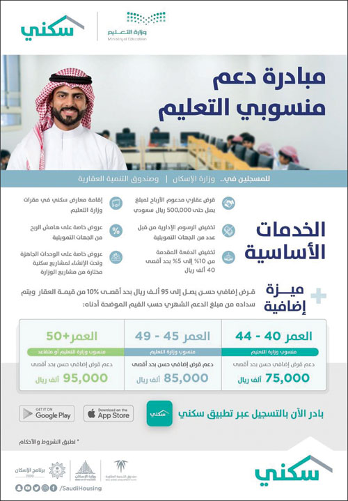 وتضمّنت الاتفاقية تقديم مزايا خاصة وغير مسبوقة لمنسوبي وزارة التعليم تتيح الحصول على قرض إضافي حسن يصل إلى 95 ألف ريال لمن تجاوزوا سن الأربعين عاما، تضاف إلى القرض الأساسي المدعوم الذي يصل إلى 500 ألف ريال، وذلك ضمن مبادرة «دعم المدنيين» التي توفّر للفئة العمرية من سن 40 إلى 44 عاماً قرضًا إضافيًّا حَسَنًا يصل إلى 75 ألف ريال، ومن 45 إلى 50 عاماً الاستفادة من 85 ألف ريال، ومن سن الـ50 عاماً وأكثر يمكنهم الاستفادة من قرض إضافي حسن يصل إلى 95 ألف ريال، وذلك في إطار التسهيلات والخِدْمات المتنوعة التي يوفرها «سكني» لمستفيديه، لتمكينهم من التملّك السكني تماشياً مع أهداف «برنامج الإسكان»، كما تنص الاتفاقية على الاستفادة من حلول برنامج «الإسكان التنموي» التابع لوزارة الإسكان لمن تنطبق عليهم الشروط.