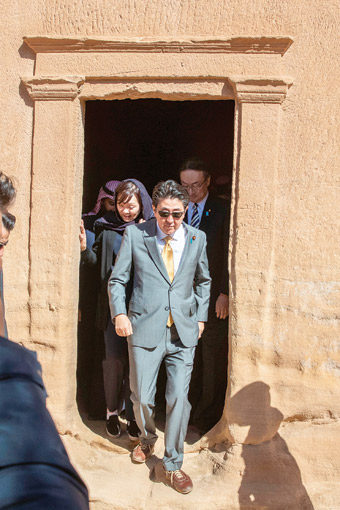 زار دولة رئيس وزراء اليابان شينزو آبي والوفد المرافق له مدائن صالح (الحجر) بمحافظة العلا. وكان في استقبال دولته عند وصوله المدائن صاحب السمو الأمير بدر بن عبدالله بن فرحان وزير الثقافة محافظ الهيئة الملكية لمحافظة العلا، ومعالي وزير الاقتصاد والتخطيط رئيس الجانب السعودي للمجموعة المشتركة للرؤية السعودية - اليابانية 2030 الأستاذ محمد بن مزيد التويجري «الوزير المرافق»، والرئيس التنفيذي للهيئة الملكية لمحافظة العلا عمرو المدني. واستمع دولته خلال الزيارة إلى شرح تاريخي عن مدائن صالح (الحجر) من عضو مجلس إدارة الهيئة الملكية لمحافظة العلا الدكتور عيد اليحيى، واطلع على العديد من المعالم الأثرية والتاريخية.