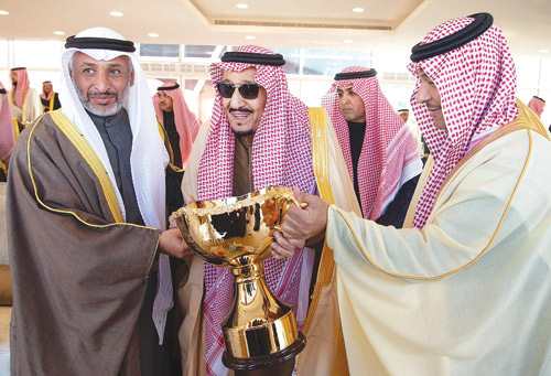 بعد ذلك تسلم خادم الحرمين الشريفين -رعاه الله- هدية تذكارية بهذه المناسبة مقدمة من نادي الإبل.