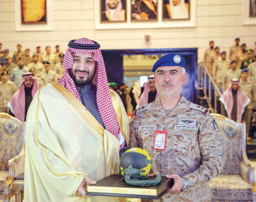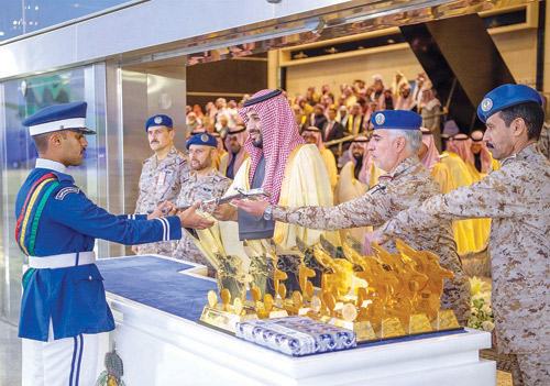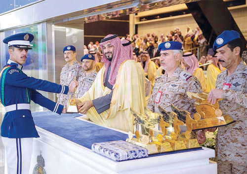وأوضح أن هذه الدورة تضم أربعة طلاب من مملكة البحرين الشقيقة وثلاثة طلاب من دولة الكويت الشقيقة، أمضوا مع زملائهم أكثر من ثلاث سنوات في ميادين التدريب ومقاعد الدراسة، أكملوا بها كل المتطلبات المتعلقة بالتأهيل العسكري والتأهيل الأكاديمي والتدريب العملي. عقب ذلك ألقيت كلمة الخريجين ألقاها الخريج راكان العطوي، عبر فيها عن سعادته وزملائه برعاية وتشريف سمو ولي العهد لحفل تخريجهم، كما أعرب عن الشكر لجميع منسوبي الكلية لما بذلوه من جهد في سبيل تأهيلهم وتدريبهم، سائلاً الله أن يحفظ خادم الحرمين الشريفين وسمو ولي العهد وأن يديم على بلادنا السلام والرخاء. إثر ذلك جرى العرض العسكري لطلبة الكلية، وتسليم راية الكلية، بعدها أدى الخريجون القسم، ثم أعلنت النتائج، وسلم سمو ولي العهد الجوائز للطلبة المتفوقين في الدورة، كما سلم سموه الشهادات للخريجين من الدول الشقيقة. بعد ذلك تسلم سمو ولي العهد هدية تذكارية من قائد الكلية بهذه المناسبة. ثم عزف السلام الملكي، والتقطت الصور التذكارية لسمو ولي العهد مع الطلبة الخريجين. بعد ذلك تسلم سمو ولي العهد هدية تذكارية من سمو قائد القوات الجوية بهذه المناسبة.