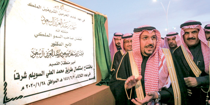 واطلع على الخدمات المقدمة لأهالي المركز. بعد ذلك توجه سموه لافتتاح طريق محمد العلي السويلم بمحافظة البكيرية والمنفذ بدعم من قبل أبناء محمد العلي السويلم -رحمه الله- بتكلفة تزيد عن 14 مليون ريال بطول 30 كلم.