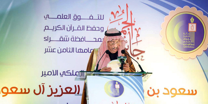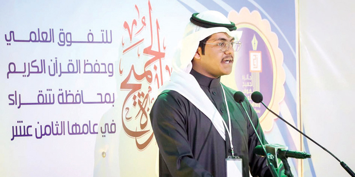 ثم ألقى رئيس مجلس إدارة الجائزة الشيخ حمد بن عبدالعزيز الجميح كلمة رحب فيها بسمو الأمير مقدرًا له هذه الرعاية، وقال: ازدانت شقراء بقدومكم وتهللت للقائكم وفرحت برعايتكم الكريمة يا صاحب السمو، وقدومكم المبارك من مسافة بعيدة من شرق المملكة وتجشمكم عناء السفر ما هو إلا دليل على اهتمامكم الكبير وحرصكم الأكيد على العلم وأهله والقرآن الكريم وحفظه والتفوق والإبداع وأهميته، وامتداد للنهج الذي سارت عليه دولتنا المباركة منذ تأسيسها، وتسير عليه حكومة خادم الحرمين الشريفين الملك سلمان بن عبد العزيز -أيده الله- وولي عهده الأمين، وما توليه من رعاية وعناية وتشجيع لأبنائنا الطلاب والطالبات لتعزيز مهاراتهم وتنمية قدراتهم وإبداعاتهم.