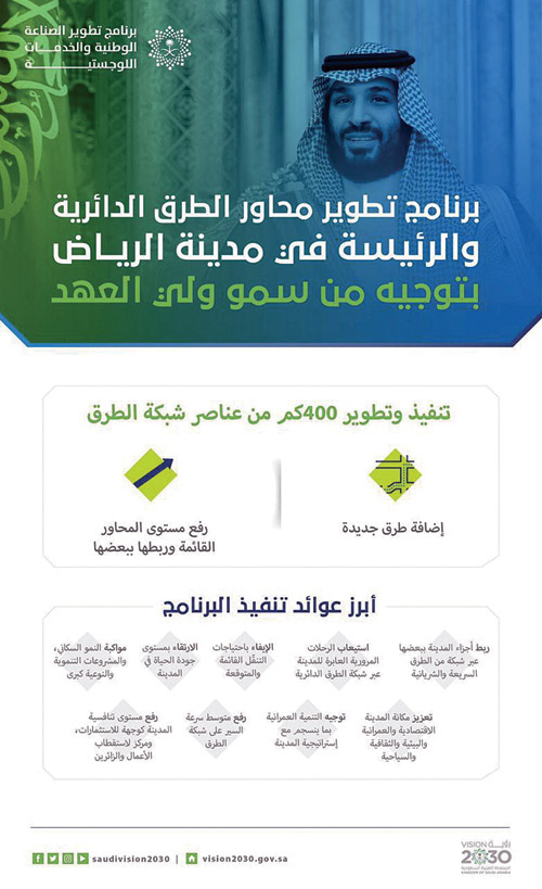 وجّه صاحب السمو الملكي الأمير محمد بن سلمان بن عبدالعزيز، ولي العهد نائب رئيس مجلس الوزراء رئيس مجلس إدارة الهيئة الملكية لمدينة الرياض، -حفظه الله-، بتطوير محاور الطرق الدائرية والرئيسة بالمدينة، بهدف الارتقاء بمستوى منظومة النقل فيها، عبر تفعيل الربط بين أجزائها، وتهيئتها لتكون مركزاً ومحوراً رئيساً في تقديم خدمات النقل المستدام والخدمات اللوجستية في منطقة الشرق الأوسط، وتعزيز دورها القيادي كإحدى حواضر العالم الكبرى، انطلاقاً من توجهات برامج «رؤية المملكة 2030». وسيشتمل برنامج تطوير محاور الطرق الدائرية والرئيسة بمدينة الرياض، على تنفيذ وتطوير (400) كيلو متر من عناصر شبكة الطرق، عبر إضافة طرق جديدة ورفع مستوى المحاور القائمة وربطها ببعضها البعض، ومن أبرزها: