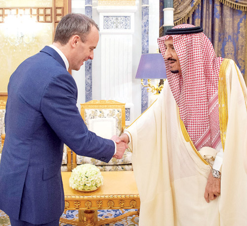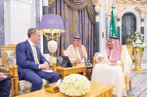 استقبل خادم الحرمين الشريفين الملك سلمان بن عبد العزيز آل سعود -حفظه الله- أمس، معالي وزير خارجية بريطانيا دومينيك راب. وتم خلال الاستقبال، استعراض العلاقات الثنائية بين البلدين الصديقين وسبل تعزيزها، وبحث مجمل القضايا الإقليمية والدولية ذات الاهتمام المشترك. حضر الاستقبال، صاحب السمو الملكي الأمير خالد بن بندر بن سلطان بن عبدالعزيز سفير خادم الحرمين الشريفين لدى بريطانيا، وصاحب السمو الملكي الأمير عبدالعزيز بن سعود بن نايف بن عبدالعزيز وزير الداخلية، وصاحب السمو الأمير فيصل بن فرحان بن عبدالله وزير الخارجية، ومعالي وزير الدولة عضو مجلس الوزراء مستشار الأمن الوطني الدكتور مساعد بن محمد العيبان، وسفير بريطانيا لدى المملكة نيل كرمبتون، وعدد من المسؤولين.