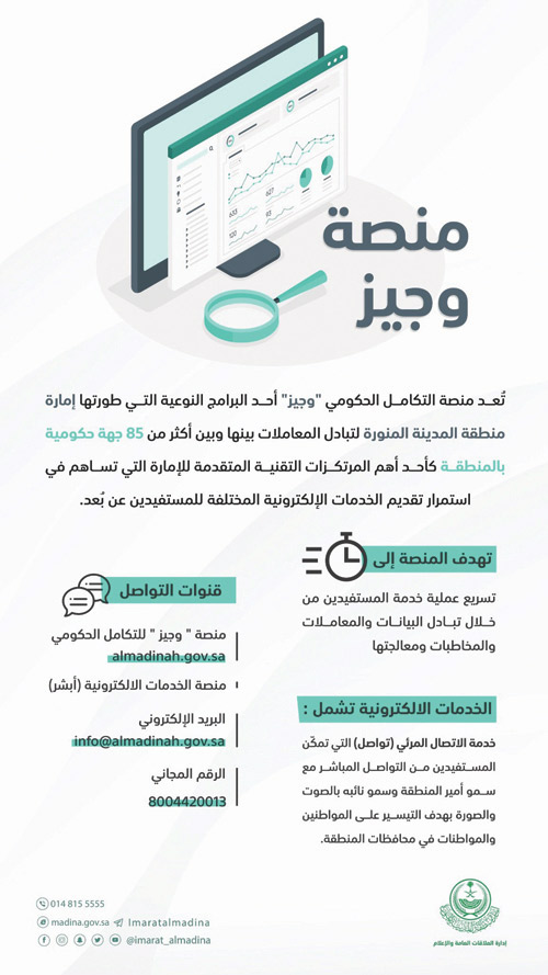 وجه صاحب السمو الملكي الأمير فيصل بن سلمان بن عبد العزيز أمير منطقة المدينة المنورة، باستمرار تقديم الخدمات للمستفيدين من المواطنين والمقيمين بالمنطقة عبر منصة التكامل الحكومي «وجيز»، وذلك خلال فترة تعليق الحضور لمقرات العمل في الجهات الحكومية كافة التي تستمر لمدة (16) يومًا، عملاً بالإجراءات الوقائية اللازمة للحد من انتشار فيروس كورونا وحرصاً على سلامة الموظف والمستفيد. وأكد الأمير فيصل بن سلمان أهمية تعزيز الدور الإلكتروني بشكل أكبر خلال المرحلة الراهنة وفق معايير عالية الجودة تقدم من خلالها الخدمات للمواطنين لإنهاء إجراءاتهم بموثوقية عالية وفي وقت قصير، بما يحقق المصلحة العامة ويحافظ على سلامة المستفيد على حد سواء. وتعد منصة التكامل الحكومي «وجيز» أحد البرامج النوعية التي طورتها إمارة منطقة المدينة المنورة لتبادل المعاملات بينها وبين أكثر من 85 جهة حكومية بالمنطقة بهدف تسريع عملية خدمة المستفيدين من خلال تبادل البيانات والمعاملات والمخاطبات ومعالجتها. يذكر أن إمارة المدينة المنورة ترتكز على بنية تقنية متقدمة وجاهزة مسبقاً أسهمت في استمرار تقديم خدماتها الإلكترونية المختلفة للمستفيدين عن بعد من خلال منصة الخدمات الإلكترونية (أبشر) ومنصة «وجيز» للتكامل الحكومي almadinah.gov.sa ، بالإضافة إلى استقبال الطلبات عبر إرسال البريد الإلكتروني info@almadinah.gov.sa، واستقبال الملاحظات على الخدمات على الرقم المجاني 800442003. كما تشمل الخدمات الإلكترونية، خدمة الاتصال المرئي «تواصل» التي تمكّن المستفيدين من التواصل المباشر مع سمو أمير المنطقة وسمو نائبه بالصوت والصورة، بهدف التيسير على المواطنين والمواطنات القاطنين في المحافظات وتمكينهم من متابعة معاملاتهم دون الحاجة لمراجعة مقر الإمارة، من خلال تجهيز مراكز استقبال وتواصل الكتروني في مبنى كل محافظة من محافظات المنطقة، لتسهيل تواصل المواطنين مع أمير المنطقة.