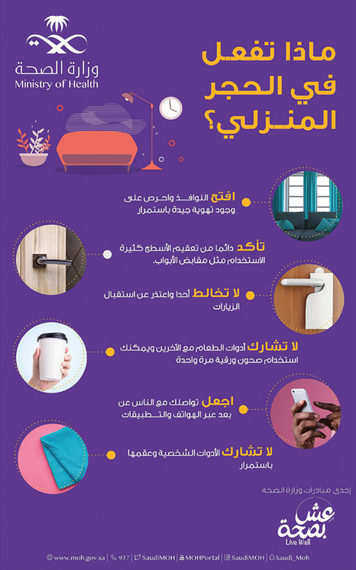 ثالثًا: إجراءات العزل لكل من قدم من خارج المملكة العزل الصحي لمدة 14 يومًا، أو من وصي لهم بالعزل المنزلي عليهم التقيد بذلك بدقة ولا يوم واحد ينقص.