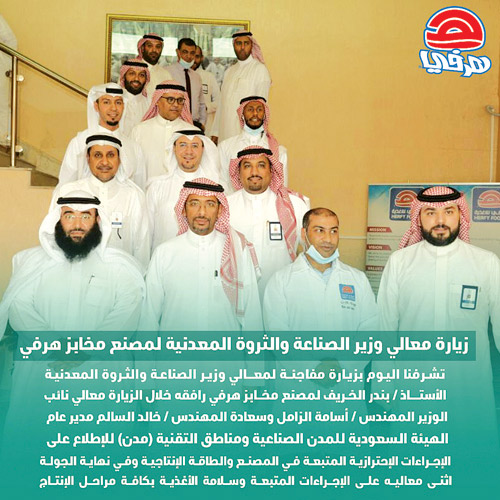 قام معالي وزير الصناعة والثروة المعدنية رئيس مجلس إدارة الهيئة السعودية للمدن الصناعية ومناطق التقنية «مدن» بندر الخريف ونائبه أسامة عبدالعزيز الزامل وعدد من مسؤولي وزارة الصناعة والثروة المعدنية، قاموا يوم الثلاثاء الماضي بزيارة مصنع خبز هرفي الاوتوماتيكي للاطمئنان على عمله 24 ساعة يوميا لتغذية الأسواق بالمملكة بجميع أنواع الخبز وبأقصى طاقة إنتاجية.