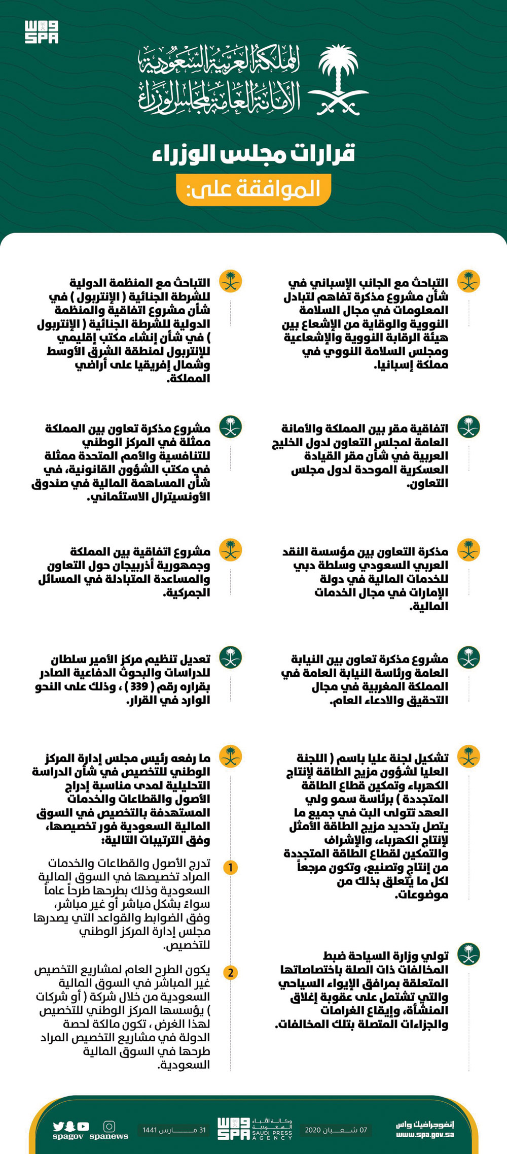 خامساً: بعد الاطلاع على ما رفعه معالي وزير المالية، وبعد النظر في قرار مجلس الشورى رقم (63/ 16) وتاريخ 18/ 5/ 1441هـ، قرر مجلس الوزراء الموافقة على مذكرة التعاون بين مؤسسة النقد العربي السعودي في المملكة العربية السعودية وسلطة دبي للخدمات المالية في دولة الإمارات العربية المتحدة في مجال الخدمات المالية. وقد أعد مرسوم ملكي بذلك.