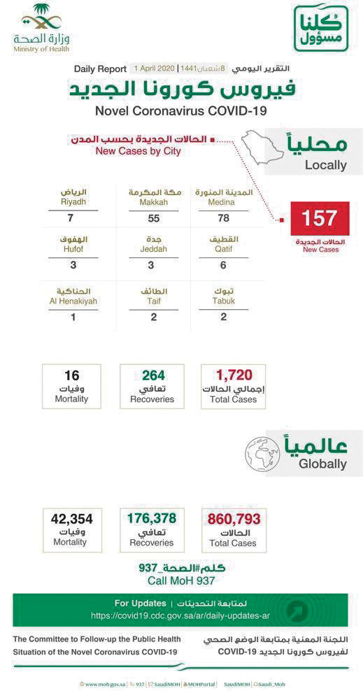 وفي المملكة سُجِّلت 157 حالة جديدة مصابة بهذا الفيروس، تُضاف للحالات السابقة, من بينها حالة لسفر وقدوم للمملكة من الخارج. وبحمد الله هي أيضًا مماثلة للحالات التي تم وقائيًّا واستباقيًّا وضعها في الحجر الصحي منذ دخول المملكة, وبقية الحالات (الـ156) ارتبطت بحالات اجتماعية واكتساب العدوى من حالات مشخصة ومصابة بهذا الفيروس سابقًا, وتم وضعها استباقيًّا في العزل الصحي المناسب.