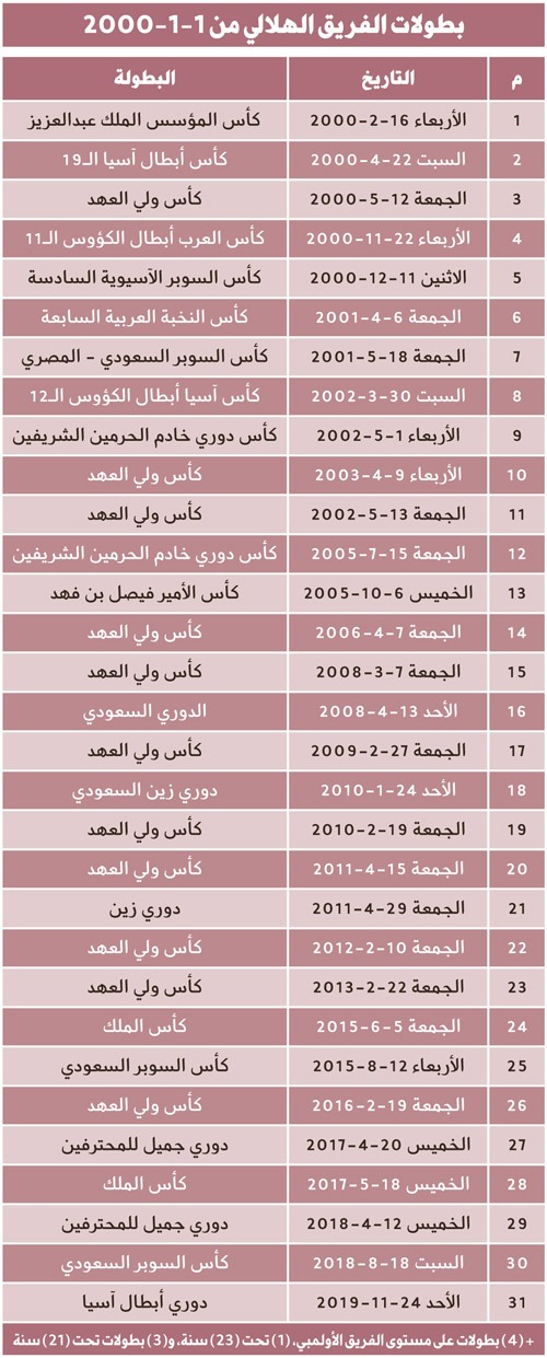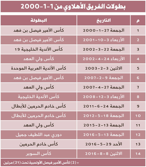 كثر الحديث في الآونة الأخيرة عن بطولات الفرق السعودية، وأصبحت بعض الفرق تتزايد بطولاتها بشكل غريب، وبدون أي شواهد أو أدلة، ولأن البطولات في عهد الألفية الجديدة مهم، ولم يتطرق له أحد، رأت «الجزيرة» التطرق لهذا الموضوع، واستضفنا المؤرِّخ والراصد الرياضي والإعلامي المعروف الزميل الأستاذ سلمان العنقري للحديث عن بطولات كل الفرق منذ تاريخ 1-1-2000، فخرجنا بالتالي: