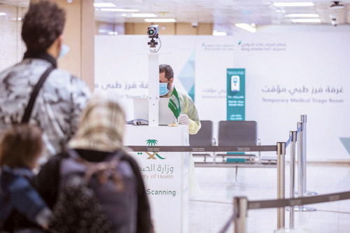 كما قامت وزارة الصحة بتخصيص نقطة فحص يتم من خلالها مرور جميع الركاب القادمين لأجهزة الكاميرات الحرارية الإلزامية للتأكد من سلامة المسافرين، وعند الاشتباه بوجود حالة بين الركاب يتم عزل الراكب عن باقي الركاب من ثم تفعيل المسار الآمن لنقل الحالة، ويلزم على الركاب تعقيم اليدين قبل البدء في إجراءات الجوازات وبصمة الدخول، وفي منطقة تفتيش الجمارك يتم المحافظة على مسافة (1.5م) على الأقل بين موظف الجمارك والراكب، كما سيتم مساعدة الركاب في منطقة مناولة الأمتعة. وفي الخطوة الأخيرة يتم فرز الركاب عند الخروج من قبل وزارة الصحة ووزارة السياحية في مسارات حسب وجهاتهم، وتوجيه الركاب لوسائل النقل المخصصة لهم من أسطول النقل التابع لشركة تطوير التعليم، حيث يتم نقل الركاب إلى دور الضيافة التي أعدتها وزارة السياحة وتشرف عليها صحياً وزارة الصحة وذلك خلال المدة المقررة للحجر الصحي بحسب الإجراءات الصحية المعتمدة لمكافحة وباء فيروس كورونا.
