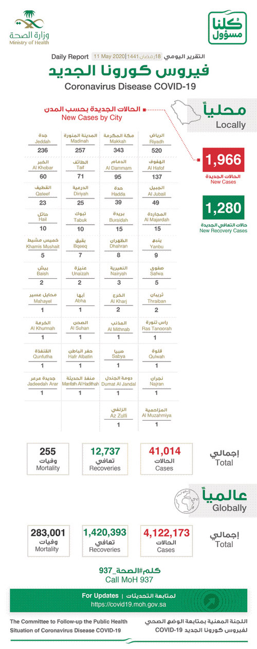 وبلغت نسبة كبار السن في الحالات المسجّلة اليوم 4 %، والأطفال 7 %، والبالغون 89 %, بينما وصل عدد المتعافين -ولله الحمد - إلى (12737) حالة، فيما بلغ عدد الوفيات (255)حالة.