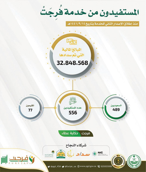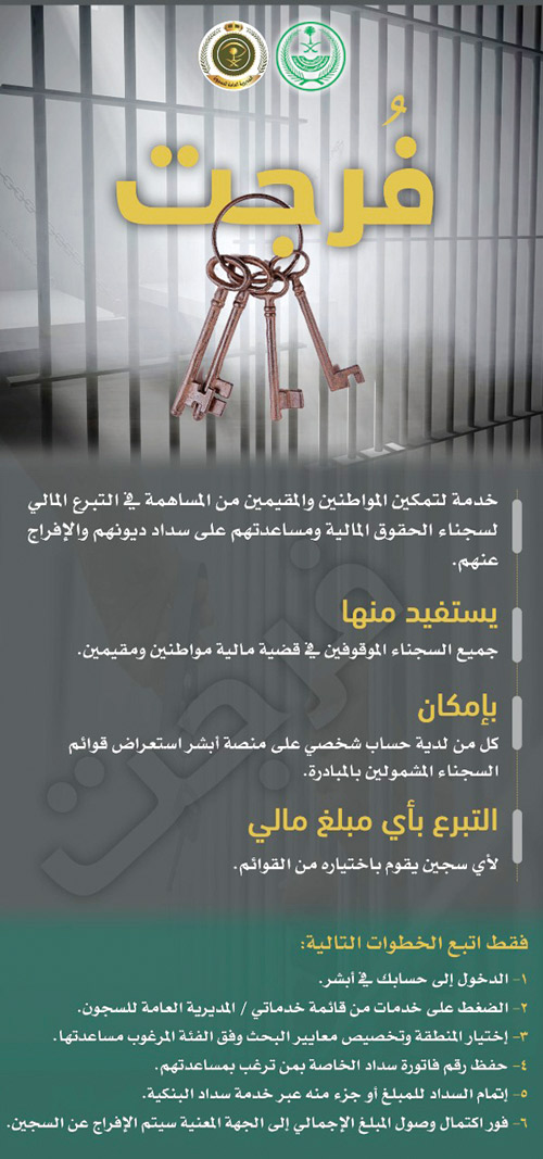 أطلقت وزارة الداخلية ممثلة في المديرية العامة للسجون الإصدار الثاني لخدمة "فرجت"، وذلك من خلال نظام أبشر. وتُمكن الخدمة المواطنين والمقيمين من المساهمة في التبرع المالي للمحكومين في القضايا المالية، ومساعدتهم على سداد دينهم، والإفراج عنهم.