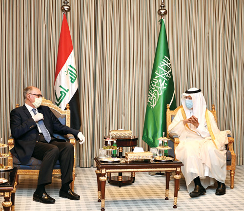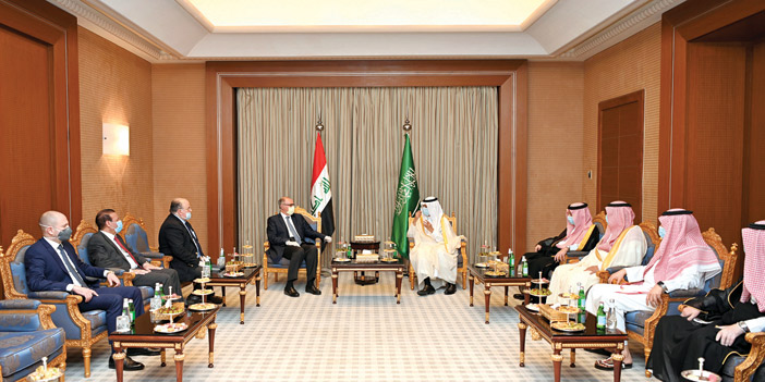 كما التقى صاحب السمو الأمير فيصل بن فرحان بن عبدالله وزير الخارجية بمعالي نائب رئيس مجلس الوزراء وزير المالية والنفط بالوكالة العراقي، حيث هنأ سموه معاليه بتشكيل الحكومة العراقية برئاسة السيد مصطفى الكاظمي ونيلها الثقة من البرلمان العراقي، وأكد سموه حرص خادم الحرمين الشريفين الملك سلمان بن عبد العزيز آل سعود وصاحب السمو الملكي الأمير محمد بن سلمان بن عبدالعزيز آل سعود ولي العهد نائب رئيس مجلس الوزراء وزير الدفاع -حفظهما الله- وحكومة المملكة على وحدة الشعب العراقي الشقيق، وأهمية التعاون مع الحكومة العراقية الجديدة لتحقيق المصالح المشتركة وتعزيز العلاقات الثنائية بين البلدين الشقيقين بما يصب في تحقيق الأمن والاستقرار للمنطقة.