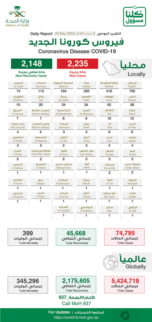 أعلن مساعد وزير الصحة المتحدث الرسمي للوزارة الدكتور محمد العبدالعالي أنه تم تسجيل 2235 حالة جديدة مؤكدة بفيروس كورونا توزعت في مجموعة من مدن المملكة، 27 % منها للأناث و73 % للذكور، وكانت نسبة 11 % من الحالات للأطفال و85 % للبالغين و4 % للفئة العمرية ما بين 65 فأكثر، و41 % من الحالات كانت للمواطنين و59 % لغير الموطنين من جنسيات أخرى متعددة.