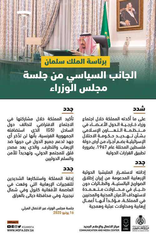واستعرض المجلس عدداً من الموضوعات حول مستجدات الأحداث وتطوراتها، على الساحتين الإقليمية والدولية، مجدداً تأكيد المملكة خلال مشاركتها في الاجتماع الافتراضي لتحالف دول الساحل (G5) الذي استضافته الجمهورية الفرنسية، بأنها لن تدّخر أي جهد لدعم جميع الدول في حربها ضد الإرهاب والتطرف، والذي يعد مصدر قلق للمجتمع الدولي، وتهديداً للأمن والسلم الدوليين.