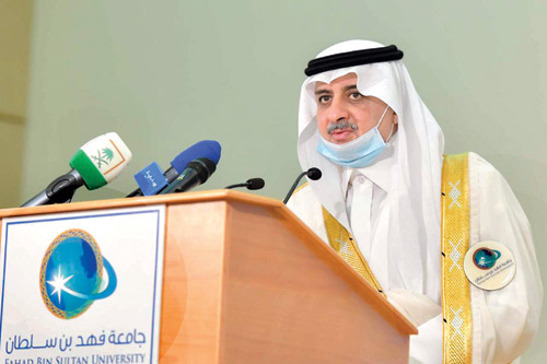 وكان الحفل الذي أقيم بمقر جامعة فهد بن سلطان قد بدأ بتلاوة آيات من الذكر الحكيم، ألقت بعدها الخريجة شذى خالد الوكيل كلمة الخريجين والخريجات، رحبت في مستهلها بسمو أمير منطقة تبوك، رافعة الشكر لله أولاً ثم لخادم الحرمين الشريفين الملك سلمان بن عبد العزيز وسمو ولي عهده الأمين -حفظهما الله- الذين أولوا الشباب عناية خاصة وزرعوا في نفوسهم القيم النبيلة، وأسسوا لديهم مبادئ الأخلاق الحميدة وبثوا فيهم روح الجد والمثابرة، قاطعةً العهد على نفسها وزملائها بالمضي قدماً بالإخلاص لله ثم المليك والوطن أمناء أوفياء لجعل راية التوحيد خفاقة علياء.