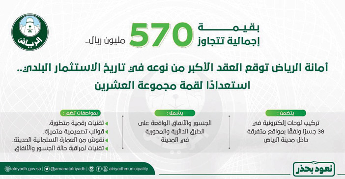 وقع صاحب السمو الأمير فيصل بن عبدالعزيز بن عياف أمين منطقة الرياض أمس عقدًا استثماريًا مع إحدى الشركات المتخصصة في الدعاية والإعلان لتركيب لوحات إلكترونيّة في 38 جسراً ونفقاً بمواقع متفرقة داخل المدينة بقيمة إجمالية تجاوزت 570 مليون ريال. ويتزامن توقيع العقد -الذي تعد قيمته الأكبر من نوعها في تاريخ الاستثمار في القطاع البلدي- مع استضافة المملكة لقمة العشرين، ومواكبًا لجهود الأمانة المستمرة لتحويل العاصمة إلى مدينة رقميّة تماشيًا مع مستهدفات برامج التحول الوطني وفق رؤية المملكة 2030. وتهدف الأمانة من خلال تنفيذها للمشروع إلى تعزيز مكانة مدينة الرياض إقليميًا ودوليًا بوصفها أحد المراكز الحضاريّة المتقدمة، ومقصدًا تجاريًا وسياحيًا رئيسًا، ولما يمثله التحوّل الرقمي من أهميّة في إبراز حجم التطوّر والازدهار الذي وصلت إليه عاصمة المملكة العربية السعودية. وأكد سمو أمين منطقة الرياض أن الأمانة تسير وفق توجيهات القيادة الرشيدة -أيدها الله- للاستعداد على الوجه الأمثل قبل استضافة المملكة العربية السعودية لأعمال الدورة الخامسة عشرة لاجتماعات قمة قادة مجموعة العشرين خلال شهر ربيع الآخر من العام 1442 في العاصمة الرياض، كما تعمل بالتنسيق مع مختلف الجهات في القطاعين العام والخاص لتجهيز مدينة الرياض للحدث الاستثنائي، بما يظهر مكانة المملكة ومدى ما حققته من نمو وتقدّم في شتى المجالات. وأشار سموه إلى أن إبرام عقد تركيب اللوحات الإلكترونيّة في جسور وأنفاق العاصمة يؤكّد السعي نحو جعل مدينة الرياض رقميّة، ومن بين المدن المنافسة على المراكز المتقدمة دوليًا. وأبان أن مشروع اللوحات الإلكترونيّة يستهدف الجسور والأنفاق الواقعة على الطرق الدائريّة والمحوريّة في العاصمة، مشيرًا إلى أنه تم إجراء دراسات مستفيضة لتحديد المواقع الملائمة لنشر الرسائل الترحيبية بضيوف المملكة في قمة مجموعة العشرين.