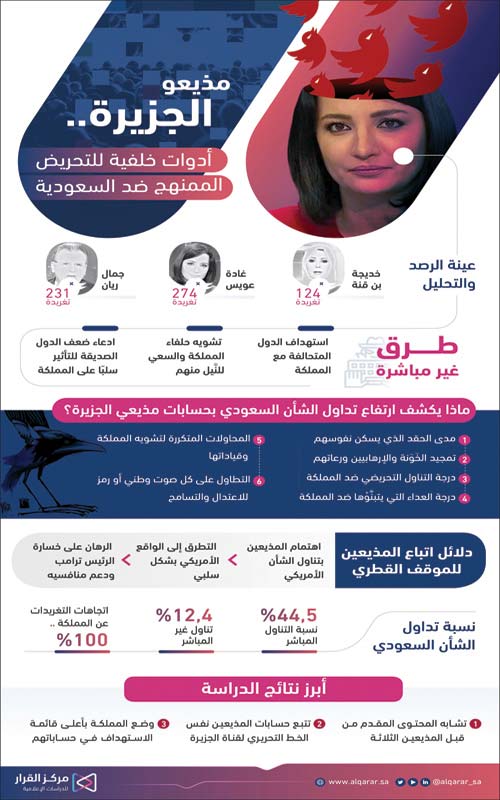 وقال المركز لقد وصلت نسبة تداول الشأن السعودي في تغريدات المذيعين إلى (56,9%) موزعة على تناول مباشر، وآخر غير مباشر، حيث احتل التناول السعودي في حساب جمال ريان نسبة (68%) فيما كانت نسبة التناول لدى غادة عويس (39,4%) وأخيرا خديجة بن قنة بنسبة (12,1%) ، وكانت جميع تغريداتهم عن المملكة في الاتجاه السلبي، دون وجود أي تغريدات إيجابية أو محايدة، وتعتمد تغريدات مذيعي الجزيرة عن المملكة على الكلام المرسل دون دليل في نسبة تقدر بـ (83%) في حين احتوت التغريدات التي تحتوى أدلة على (17%) من الأدلة التي هي الأخرى مضللة.