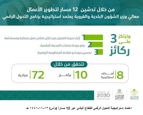 وفيما يتعلق بالشق التنفيذي للاستراتيجية، فقد تم إنشاء 12 مساراً لتطوير الأعمال لتطوير الخدمات الرقمية، وتجربة العميل، وتمكين التقنية في القطاع البلدي.