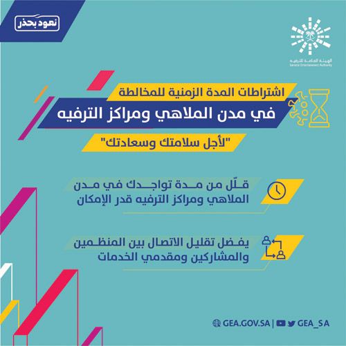 وتأتي هذه العودة بعد أن نشرت الهيئة العامة للترفيه في وقت سابق الدليل الإرشادي لعودة الأنشطة الترفيهية والذي قدمت من خلاله شروط العودة لممارسة جميع أنواع الأنشطة الترفيهية، حيث جاءت اشتراطات عودة العمل في مراكز الترفيه لتحقق سلامة الزوار منذ وصولهم إلى مغادرتهم، بما في ذلك التنقل والدخول والخروج من خلال مسارات واضحة المعالم، وتباعد الزوار، وترك مسافة آمنة بين الألعاب، بالإضافة إلى تحديد الطاقة الاستيعابية للمكان.