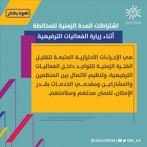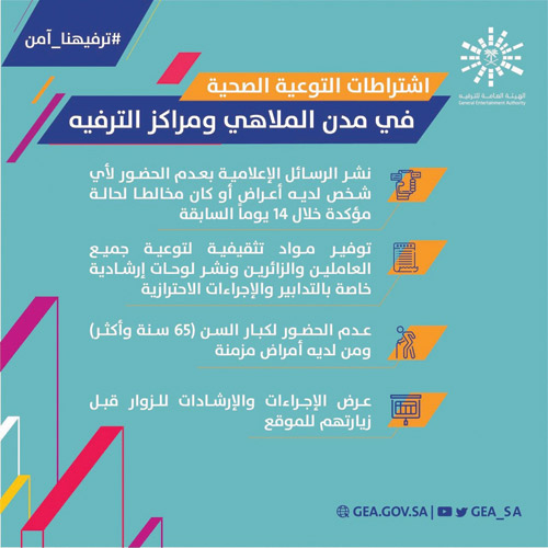 وأصدرت الهيئة العامة للترفيه منتصف يونيو الماضي الدليل الإرشادي لعودة الأنشطة الترفيهية والتي سيتم الإعلان عن تاريخها من قبل الجهات المعنية في وقت لاحق، واشتمل الدليل على بروتوكولات مدن الملاهي والمراكز الترفيهية وبروتوكولات إقامة الفعاليات والتي تتماشى مع خطة العودة بحذر، وتضمنت الإجراءات عدة جوانب وهي التوعية الصحية، التباعد الجسدي، المدة الزمنية للمخالطة، والبعد التنظيمي، والوقائي.
