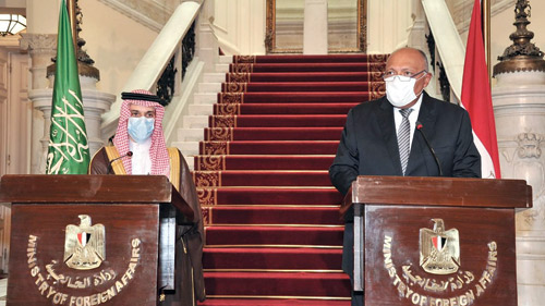 من جانبه رحب معالي وزير الخارجية المصري سامح شكري بسموه في أول زيارة له لمصر منذ توليه مهام منصبه، وهو ما يعكس تميز العلاقات بين البلدين الشقيقين في شتى المجالات، مشيدا بمستوى الروابط بين المملكة ومصر في ضوء توجيهات القيادة السياسية فى البلدين والتنسيق المشترك لمواجهة التحديات المشتركة. وقال شكري « إن الرئيس عبد الفتاح السيسي استقبل سمو وزير الخارجية وتم خلال اللقاء التأكيد على توجيهات الرئيس السيسي وخادم الحرمين الشريفين لتكثيف التعاون واستمرار العمل المشترك للتعامل مع القضايا العربية خاصة استعادة الأمن والاستقرار». وأوضح شكري أن المباحثات تناولت العلاقات الثنائية وتفعيل آليات التعاون القائمة بين البلدين بشكل كامل، معربا عن تطلعه لاستمرار التنسيق الوثيق لما فيه مصلحة البلدين والأمن والاستقرار العربي بشكل كامل. وبشأن الملف الليبي أوضح وزير الخارجية المصري أن القضية الليبية شهدت مشاورات كثيفة من قبل مصر عربيا وإقليميا، مجددا التأكيد على الموقف المصري الساعي لتحقيق السلام والاستقرار في ليبيا في إطار وقف إطلاق النار، والهادف ليس إلى التصعيد وإنما استقرار الوضع على الساحة الليبية من الناحية العسكرية وانخراط كافة مكونات الشعب الليبي في العملية السياسية. وقال « إن هذه العملية لابد وأن تأتي بعد هذه الفترة الطويلة والمعاناة لتتناول كافة القضايا المتعلقة بالحل السياسي من حيث تشكيل المجلس الرئاسي، وتشكيل حكومة تلبي احتياجات الشعب الليبي، ومسؤوليات مجلس النواب في الإشراف على الحكومة، والتوزيع العادل للثروة، والوقف الرسمي لإطلاق النار، وإعادة ضخ البترول وتوزيع عوائده بشكل متساو على جميع الشعب الليبي «. وشدد وزير الخارجية المصري على ضرورة التصدي لكل المحاولات الخارجية من أطراف إقليمية لتوسيع رقعة تواجدها ونفوذها وتأثيرها السلبي على الساحة العربية، قائلا: «نحن مسؤولون عن الأمن والاستقرار في المنطقة العربية من خلال العمل المشترك في إطار الجامعة العربية والإطار الثنائي.. ولا نرضى أن تكون المقدرات مع طرف خارج الإطار العربي». وفي ختام المؤتمر أقام معالي وزير الخارجية بجمهورية مصر العربية سامح شكري، مأدبة غداء تكريما لصاحب السمو الأمير فيصل بن عبدالله بن فرحان وزير الخارجية بمناسبة زيارته إلى القاهرة. حضر المأدبة الوفدان المرافقان لسمو وزير الخارجية ومعالي وزير الخارجية المصري. وكاند عقد سمو وزير الخارجية جلسة مباحثات مع معالي وزير الخارجية بجمهورية مصر العربية سامح شكري، وذلك بقصر التحرير في القاهرة. وتناولت المباحثات العلاقات المتميزة بين البلدين الشقيقين وتطورات الأوضاع على الساحة الإقليمية. وتضمن اللقاء اجتماعا ثنائيا بين الوزيرين ثم اجتماعا موسعا ضم الوفد المرافق. وأكد سمو وزير الخارجية خلال الاجتماع الحرص المشترك للتشاور والتباحث بين البلدين الشقيقين في القضايا الثنائية والإقليمية والدولية كافة بما يؤدي إلى التنسيق المشترك. وأعرب سموه عن تقديره لحرص فخامة الرئيس عبدالفتاح السيسي خلاله استقباله له على تعزيز علاقات بلاده مع المملكة العربية السعودية بما يخدم مصالح شعبي البلدين الشقيقين. من جهته رحب معالي وزير الخارجية المصري بسمو وزير الخارجية، متمنيا أن يخرج الاجتماع بما يخدم مصالح البلدين الشقيقين والمنطقة العربية.