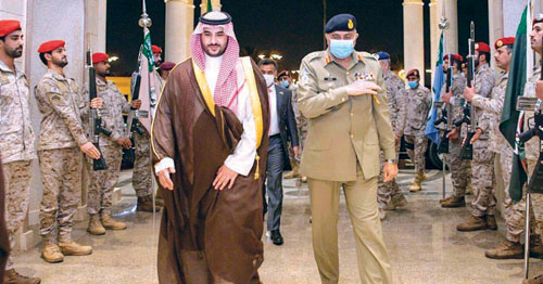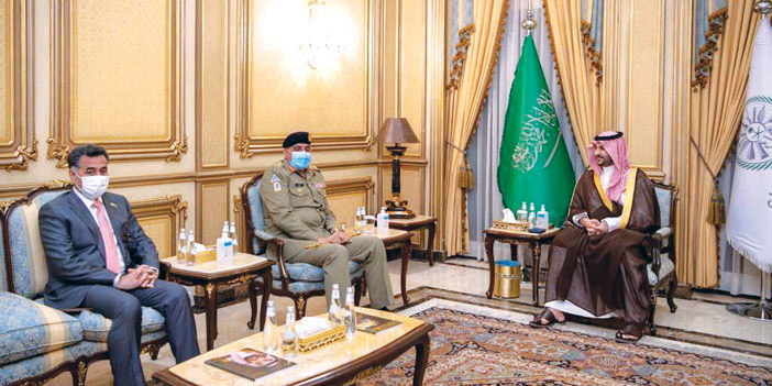 استقبل صاحب السمو الملكي الأمير خالد بن سلمان بن عبدالعزيز نائب وزير الدفاع في الرياض أمس معالي قائد الجيش الباكستاني الفريق الأول الركن قمر جاويد باجوا الذي يزور المملكة حالياً. وجرى خلال اللقاء استعراض العلاقات الثنائية بين البلدين الشقيقين خاصة في الجانب العسكري والدفاعي، وتناول تعزيز التعاون المشترك لحفظ الأمن والاستقرار بالإضافة إلى الموضوعات ذات الاهتمام المشترك. حضر اللقاء معالي رئيس هيئة الأركان العامة الفريق الأول الركن فياض بن حامد الرويلي والمستشار العسكري لسمو وزير الدفاع اللواء المهندس الركن طلال بن عبدالله العتيبي ومدير عام مكتب سمو نائب وزير الدفاع هشام بن عبدالعزيز بن سيف.