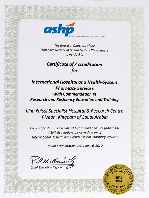 حصل مستشفى الملك فيصل التخصصي ومركز الأبحاث بالرياض ممثلاً بقطاع الرعاية الصيدلية على الاعتماد الدولي لخدمات صيدلة المستشفيات والنظام الصحي من الجمعية الأمريكية لصيادلة النظام الصحي (American Society of Health-System Pharmacists-ASHP) كأول مركز طبي عالمي خارج الولايات المتحدة كما حاز قطاع الرعاية الصيدلية في المستشفى على التميز الخاص في مجالي الأبحاث والتدريب لبرامج الإقامة.