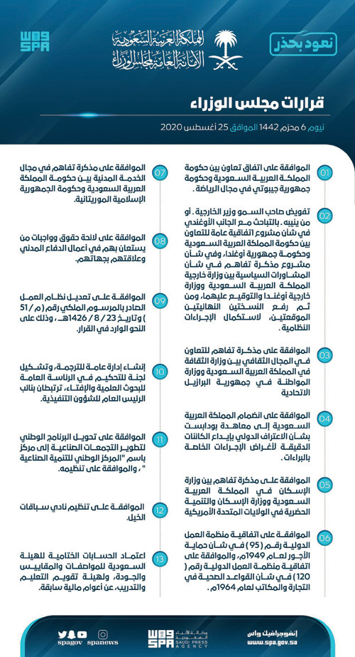 بعد ذلك اطلع مجلس الوزراء، على مستجدات جائحة فيروس كورونا على النطاقين المحلي والعالمي، وما سجلته آخر الإحصاءات عن الحالات في المملكة، في ظل استقرار الوضع الصحي، والتواصل المستمر في ارتفاع حالات التعافي، والنزول التدريجي في انتشار الفيروس، وتسجيل معدل يعد الأقل عالمياً في حالات الوفيات، وذلك بفضل الله -عز وجل- ثم بفضل اتخاذ الخطوات الاستباقية وتطبيق الاحترازات الوقائية والبروتوكولات العلاجية والخدمات الصحية التي هيأتها القيادة الحكيمة للإسهام في الحفاظ على صحة وسلامة المواطنين والمقيمين في مناطق المملكة كافة. وأعرب المجلس عن تطلعاته بأن يكون العام الهجري الجديد 1442هـ عام خير وبركة وأمن واستقرار على الأمتين العربية والإسلامية والعالم أجمع.