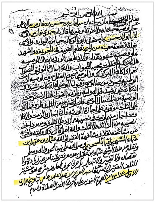 يعلم الواقف على مازبر من أن سليمان بن حسن بن فارس سألني عن حكم وصية جده له ولإخوته وغيرها قال إن جدي فارس أوصى لنا أولاد حسن بما يستحق أبونا لو كان حيًا من الميراث وأوصى بغلة قطعة معينة من الميح تطعم الضيف في الجريفة وأشهد على وصيته شهود عدل وأراد بعض الورثة إبطال الوصية، هل له ذلك أم لا؟ فقلت مجيبًا للمجواب والله أسأل التوفيق للصواب نعم إذا كان الأمر كذلك والموصي صحيح العقل حين الوصية لزمت الوصية بمجرد موت الموصي وقبول الموصى له إن كان رشيداً أو إن كان غير رشيد قبل له وليه ويلزمه القبول، لهذا إن خرجت الوصية من ثلث مال الموصي فإن لم تخرج من الثلث فلزم ما زاد على الثلث موقوف على إجازة الورثة فإن أجازوا لزمت وإلا فلا، ومن أجاز منهم لزمت في نصيبه مما زاد على الثلث ومن رد أخذ نصيبه من الزائد على الثلث والله أعلم، قال ذلك وكتبه وأفتى به عن مشايخه نقلاً ومشافهة الفقير إلى الله عثمان بن عقيل بن عثمان الشهير لقبًا بالسحيمي، وصلى الله على نبينا محمد وآله وسلم. ونقله من خط الشيخ عثمان بن عقيل بعد معرفته يقينًا من غير زيادة ولا نقصان ولا تغيير ولا تبديل بل حرفًا بحرف لعارض شرعي هو خشية التلف الفقير إلى الله عبدالعزيز بن عبدالله بن عامر بتاريخ جمادى الأول 1312 من الهجرة النبوية على مهاجريها أفضل الصلاة والسلام.