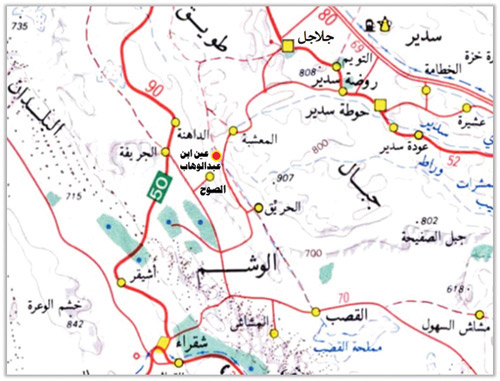 قصر وعين ابن عبدالوهاب الفياض المحاذي لجبل طويق ويبعد عن: الجريفة (8) كيلومترات، والداهنة (9) كيلومترات، وروضة سدير (23) كيلومترات