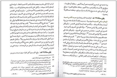 (12) كما هو معروف في بعض بلدان نجد التي هجرت فأصبحت خراباً ثم جدد عمارتها أشخاص انتقلوا إليها فيعتبرون هم المؤسسون لها في العصور المتأخرة، والقائمون بعمارتها من بناء وزراعة وغيره... مثل: بلدة التويم في سدير التي عمرها مدلج بن حسين الوائلي، عام 700هـ تقريباً، وبلدة حرمة في سدير التي عمرها: إبراهيم بن حسن بن مدلج، عام 770هـ تقريباً، وغيرها... ومعروف أن بلدة التويم وحرمة أصلهما قديم ومذكور في كتب المنازل والديار القديمة. ينظر: تاريخ بعض الحوادث الواقعة في نجد. إبراهيم بن صالح بن عيسى، ط الأولى، 1386هـ، -دار اليمامة- ص 28- 31. وأيضاً: بلاد العرب. مرجع سابق، ص256 وص 262. بتصرف.