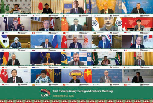 عقد وزراء الخارجية في مجموعة العشرين اجتماعا استثنائيا لمناقشة سبل تعزيز التعاون الدولي للتعافي من آثار جائحة فيروس كورونا المستجد بالإضافة إلى رفع مستوى الجاهزية للازمات المستقبلية. كما تباحث الوزراء وممثلو المنظمات الدولية طرق تنسيق التدابير الاحترازية عبر الحدود لأجل حماية الأرواح.