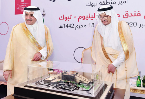 افتتح صاحب السمو الملكي الأمير فهد بن سلطان بن عبدالعزيز أمير منطقة تبوك أمس, في المدينة الجامعية بجامعة تبوك، فندق «جراند ميلينيوم» تبوك التابع لصندوق التعليم العالي, بحضور معالي وزير التعليم رئيس مجلس إدارة صندوق التعليم العالي الجامعي الدكتور حمد بن محمد آل الشيخ.