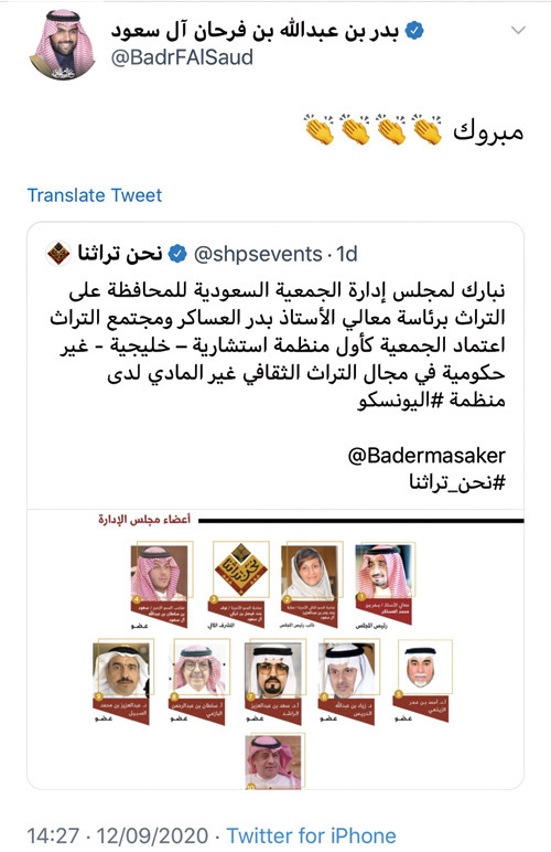 يذكر أن جمعية «نحن تراثنا» قد تجاوزت المعايير والمتطلبات بتوصية من لجنة التراث الثقافي غير المادي خلال اجتماع اللجنة الحكومية الـ «14» لاتفاقية صون التراث الثقافي غير المادي لمنظمة اليونسكو، الذي عقد خلال الفترة من 8-14 ديسمبر 2019م، وبناء على هذه التوصية، صدر قرار الاعتماد الرسمي خلال اجتماع الجمعية العمومية للتراث الثقافي غير المادي لمنظمة إليونسكو مطلع شهر سبتمبر من العام 2020.