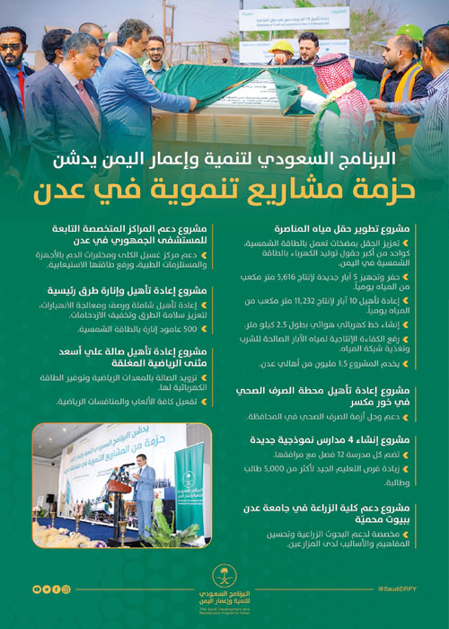 وقال مدير مكتب البرنامج السعودي لتنمية وإعمار اليمن في محافظة عدن المهندس أحمد عواجي مدخلي خلال حفل الافتتاح: إن البرنامج سيدشن حزمة من مشاريع البرنامج السعودي لتنمية وإعمار اليمن في محافظة عدن، ووضع حجر الأساس لمجموعة من المشاريع التنموية التي يسعى البرنامج من خلالها إلى تحسين البنية التحتية، بما له أثر مباشر وإيجابي على حياة أهالي المحافظة.