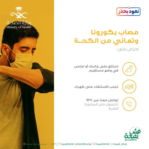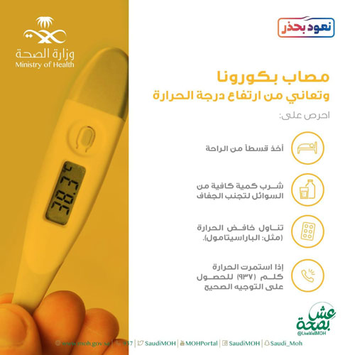دعت وزارة الصحة المصابين بفيروس كورونا المستجد كوفيد 19، ويعاني من ارتفاع درجة الحرارة بأخذ قسط من الراحة، والحرص على شرب كمية كافية من السوائل لتجنب الجفاف. وأبانت عبر إنفوجرافيك نشرته في حسابها على تويتر ومنصتها التوعوية «عش بصحة» بتناول خافض الحرارة (مثل الباراسيتامول) والتواصل مع مركز 937 في حال استمرار ارتفاع درجة الحرارة، وذلك للحصول على التوجيه الصحيح. كما دعت «الصحة» المصاب بكورونا، ويعاني من الحكة بالاستلقاء على الجانب أو الجلوس في وضع مستقيم، مع تجنب الاستلقاء على الظهر، وكذلك التواصل مع فريق 937 لأخذ المشورة الطبية. أما المصاب بكورونا ويعاني من ضيق تنفس بسيط، فقد أكدت «الصحة» على أهمية المحافظة على الهدوء والجلوس بشكل معتدل على المقعد وإرخاء الكتفين، والتنفس بعمق (شهيق من الأنف مع إبقاء الفم مغلق ثم إخراج الزفير من الفم ببطء)، ويمكن الاطلاع على الإنفوجرافيك عبر الرابط التالي https://twitter.com/livewellmoh/status/1305890026794946562?s=21. وجدّدت «الصحة» التوصية لكل مَنْ لديه أعراض التوجه لعيادات تطمن التي هيأتها «الصحة» لخدمة مَنْ يشعر بأعراض فيروس (كورونا) المستجد، أو مراكز تأكد التي خصّصتها الصحة لخدمة الذين لا يشكون أعراضًا، أو لديهم أعراض خفيفة، ويظنون أنه حدثت لهم مخالطة لشخص مصاب، وذلك بحجز موعد من خلال تطبيق (صحتي)، أو الاتصال برقم مركز (937) للاستشارات والاستفسارات على مدار الساعة، الذي أصبح الآن أقرب إلى الجميع من ذي قبل، بحيث يمكن الاستفادة من خدماته التفاعلية، من خلال تطبيق (واتس آب) عبر رقم 920005937، والاستفادة من الخدمات التفاعلية الجديدة الموجودة به، والحصول على المعلومات الصحية والخدمات، ومعرفة مستجدات فيروس (كورونا)، ومراكز الرعاية الأولية، ومراكز التبرع بالدم، والمواعيد وكيفية الحصول عليها.