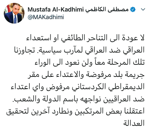 وقال رئيس الوزراء العراقي في تغريدة على حسابه في «تويتر»: لا عودة إلى التناحر الطائفي أو استعداء العراقي ضد العراقي لمآرب سياسية. وتابع: تجاوزنا تلك المرحلة معاً ولن نعود إلى الوراء، جريمة بلد مرفوضة والاعتداء على مقر الديمقراطي الكردستاني مرفوض، وأي اعتداء ضد العراقيين نواجهه باسم الدولة والشعب.