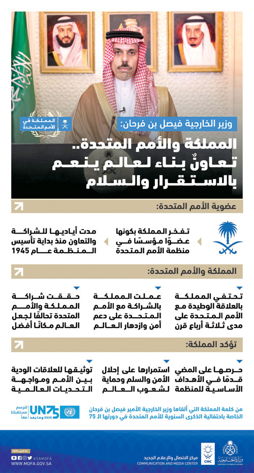 أكد صاحب السمو الأمير فيصل بن فرحان بن عبدالله وزير الخارجية، أن المملكة العربية السعودية كانت ولا تزال وسيطة للسلام لإنهاء العديد من الصراعات الدولية جنباً إلى جنب مع الأمم المتحدة، وأجهزتها المختلفة في سبيل كل ما فيه خير للبشرية. جاء ذلك في كلمة المملكة العربية السعودية خلال الاجتماع رفيع المستوى للاحتفال بالذكرى السنوية 75 لتأسيس الأمم المتحدة، ألقاها افتراضياً سمو وزير الخارجية. وهنأ سموه في بداية الكلمة معالي السفير فولكان بوزكير لانتخابه رئيساً للدورة الخامسة والسبعين للجمعية العامة للأمم المتحدة، مقدماً شكره لمعالي البروفيسور تيجاني محمد باندي على جهوده المبذولة خلال رئاسته للدورة الرابعة والسبعين للجمعية العامة، ولمعالي الأمين العام للأمم المتحدة أنطونيو غوتيريس، على جهوده المميزة والدؤوبة لتحقيق مقاصد ميثاق الأمم المتحدة. وقال سمو وزير الخارجية: نحتفل اليوم بالذكرى الخامسة والسبعين لإنشاء وتأسيس منظمة الأمم المتحدة، هذه المنظمة التي قامت على مبادئ وأسس سامية، وأنشئت لتحقيق الأمن والسلم في أرجاء العالم، وجاء ميثاقها مؤكداً على ضرورة تضافر الجهود وتوثيق أواصر التعاون بين الدول للرقي بهذا العالم، ولتنعم شعوب العالم بالاستقرار والرخاء والسلام، وإن بلادي المملكة العربية السعودية تفخر بكونها عضواً مؤسساً في منظمة الأمم المتحدة، إذ مدت أياديها للشراكة والتعاون منذ بداية تأسيس المنظمة عام 1945، إيماناً منها بأهمية التعاون الدولي المشترك، مؤكداً أنه منذ ذلك الحين حملت المملكة على عاتقها مسؤولية تحقيق مقاصد ميثاق الأمم المتحدة في الحفاظ على أمن وسلامة شعوب العالم. وأضاف سمو الأمير فيصل بن فرحان: ها هي بلادي تواصل اليوم جهودها الملموسة بقيادة خادم الحرمين الشريفين الملك سلمان بن عبدالعزيز آل سعود -حفظه الله- لمتابعة مسيرتها الميمونة لتحقيق الاستقرار والرخاء والنمو والسلام في المنطقة والعالم، فلم تتوان يوماً عن الاستجابة لنداءات الاستغاثة الإنسانية حول العالم، ولم تدخر جهداً في تقديم يد العون والعطاء للدول المنكوبة والمحتاجة، ولم تتراخ في تكريس جهودها لدفع الشرور المحدقة بالمنطقة، لتحقيق الأمن والسلام لدول الجوار لتنعم المنطقة بالرخاء والاستقرار، كما أن بلادي كانت ولا تزال وسيطة للسلام لإنهاء العديد من الصراعات الدولية جنباً إلى جنب مع الأمم المتحدة، وأجهزتها المختلة في سبيل كل ما فيه خير للبشرية. وأردف سموه: إن للتعاون العالمي وتضافر الجهود الدولية لتحقيق الأمن والرخاء أثر فعال وإيجابي ينعكس على حياة الشعوب، ولقد سعت بلادي المملكة العربية السعودية لتحقيق ذلك من خلال المشاركة البناءة في مبادرات الأمم المتحدة، بدءاً من المشاركة في وضع أهداف التنمية المستدامة، والتنسيق فيما يتعلق بالجهود المشتركة لمكافحة الإرهاب، وأخيراً ما بذلته المملكة العربية السعودية بالتعاون مع الأمم المتحدة في مكافحة وباء كورونا (كوفيد – 19) الذي اجتاح العالم، والتصدي لآثاره الصحية والاجتماعية والاقتصادية. وتابع سمو وزير الخارجية قائلاً: إيماناً من المملكة بدورها الريادي والقيادي عالمياً، واستشعاراً منها لأهمية العناية بالإنسان في كل مكان، وبصفتها دولة الرئاسة لمجموعة العشرين لعام 2020 دعا خادم الحرمين الشريفين الملك سلمان بن عبدالعزيز آل سعود، إلى عقد قمة افتراضية، لقادة دول مجموعة العشرين والدول المدعوة والمنظمات الدولية وعلى رأسها الأمم المتحدة، لمناقشة سبل المضي قدماً في تنسيق الجهود العالمية لمكافحة جائحة كورونا، والتخفيف من آثارها الإنسانية والاجتماعية والاقتصادية، ولحماية الاقتصاد العالمي وتعزيز التعاون الدولي، وتلا هذه القمة إعلان المملكة عن تبرعها بـ500 مليون دولار أمريكي لتغطية الفجوة التمويلية في الخطة الاستراتيجية للتأهب والاستجابة التابعة لمنظمة الصحة العالمية، تحقيقاً لمخرجات قمة قادة دول مجموعة العشرين الاستثنائية التي اتف