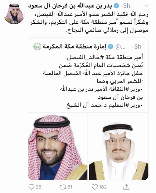 من جهة أخرى استقبل سمو أمير منطقة مكة المكرمة في مقر الإمارة بجدة، الرئيس العام لشؤون المسجد الحرام والمسجد النبوي الشيخ الدكتور عبدالرحمن السديس يرافقه الشيخ الدكتور بندر بليلة عضو هيئة كبار العلماء وإمام وخطيب المسجد الحرام. واستمع الأمير خالد الفيصل إلى شرحٍ عن خطة رئاسة الحرمين في المسجد الحرام والمتزامنة مع المرحلة الثالثة للعودة التدريجية للعمرة والهادفة لرفع الطاقة الاستيعابية إلى 20 ألف معتمر يومياً و60 ألف مصلّ. كما هنأ سموه الدكتور بليلة بمناسبة تعيينه عضواً في هيئة كبار العلماء سائلا الله له التوفيق والسداد، فيما عبرّ فضيلته عن شكره وتقديره للأمير خالد الفيصل.